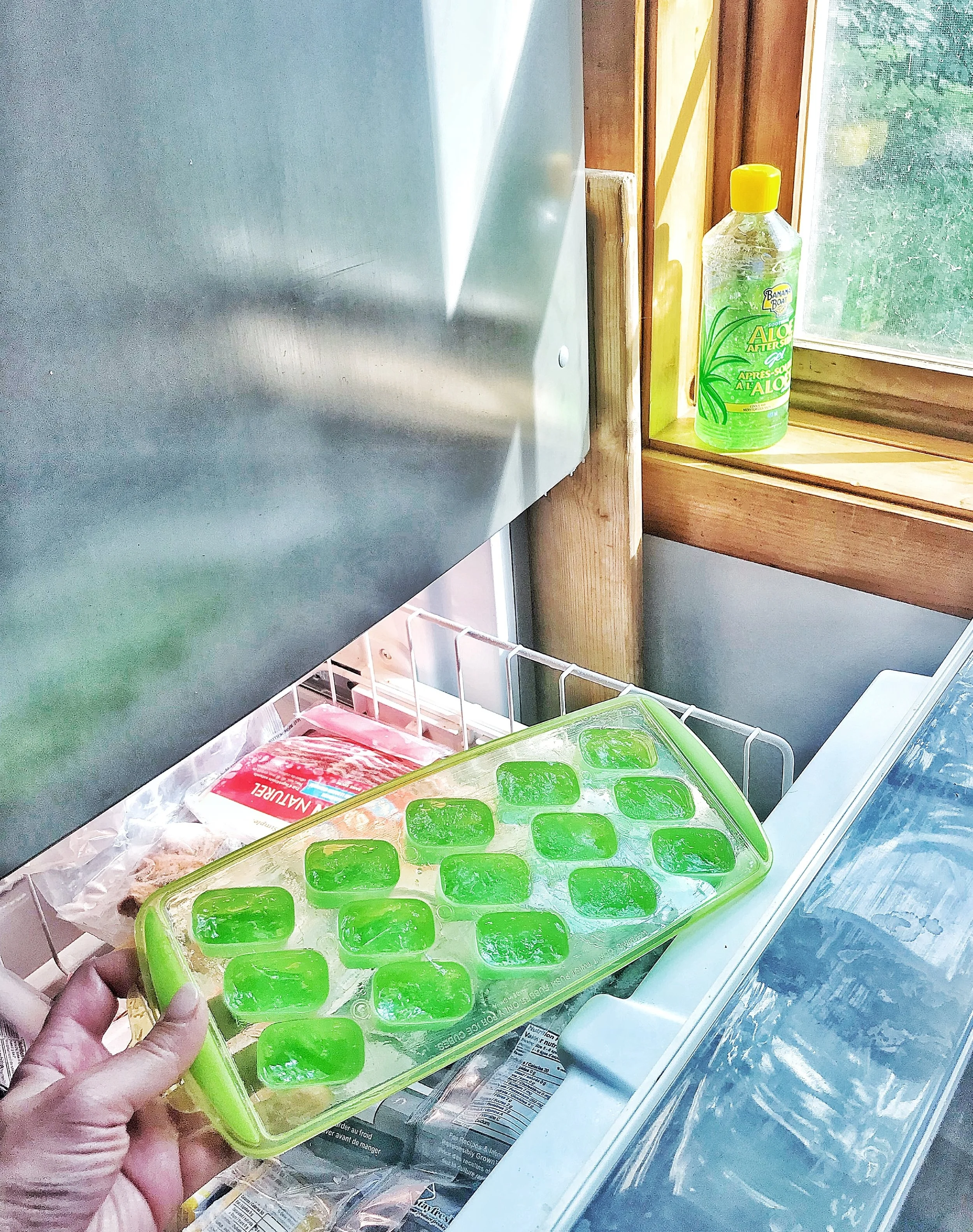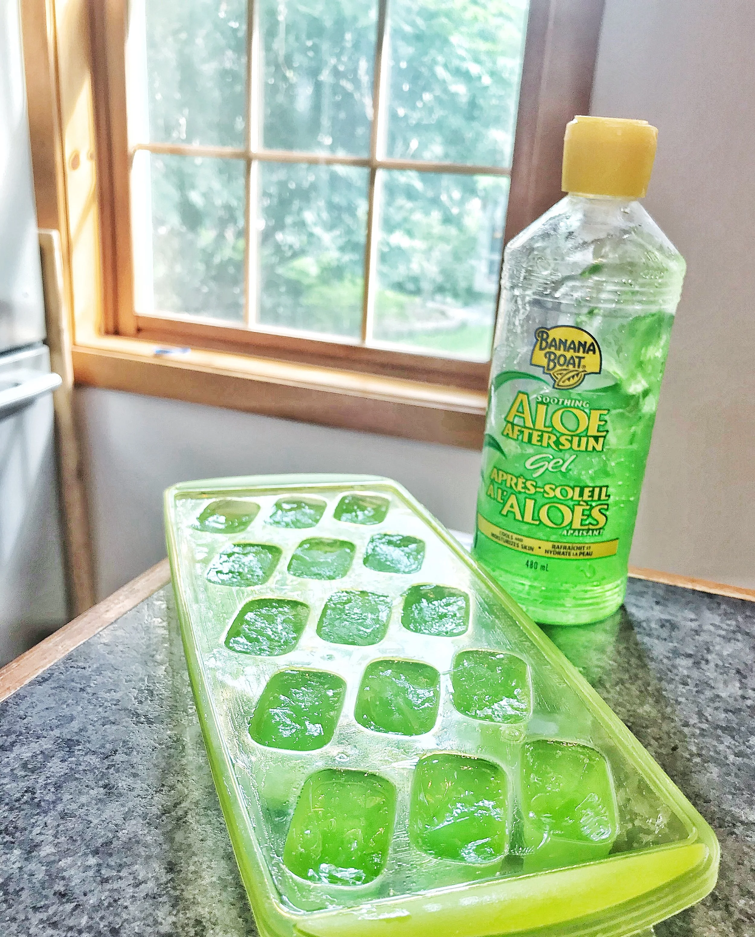 Fill and ice cube tray with aloe vera gel and freeze it. When you have a sun burn, or if the kids get too much sun, pop out an individual cube and rub it on the burn. It will cool and sooth the area.
