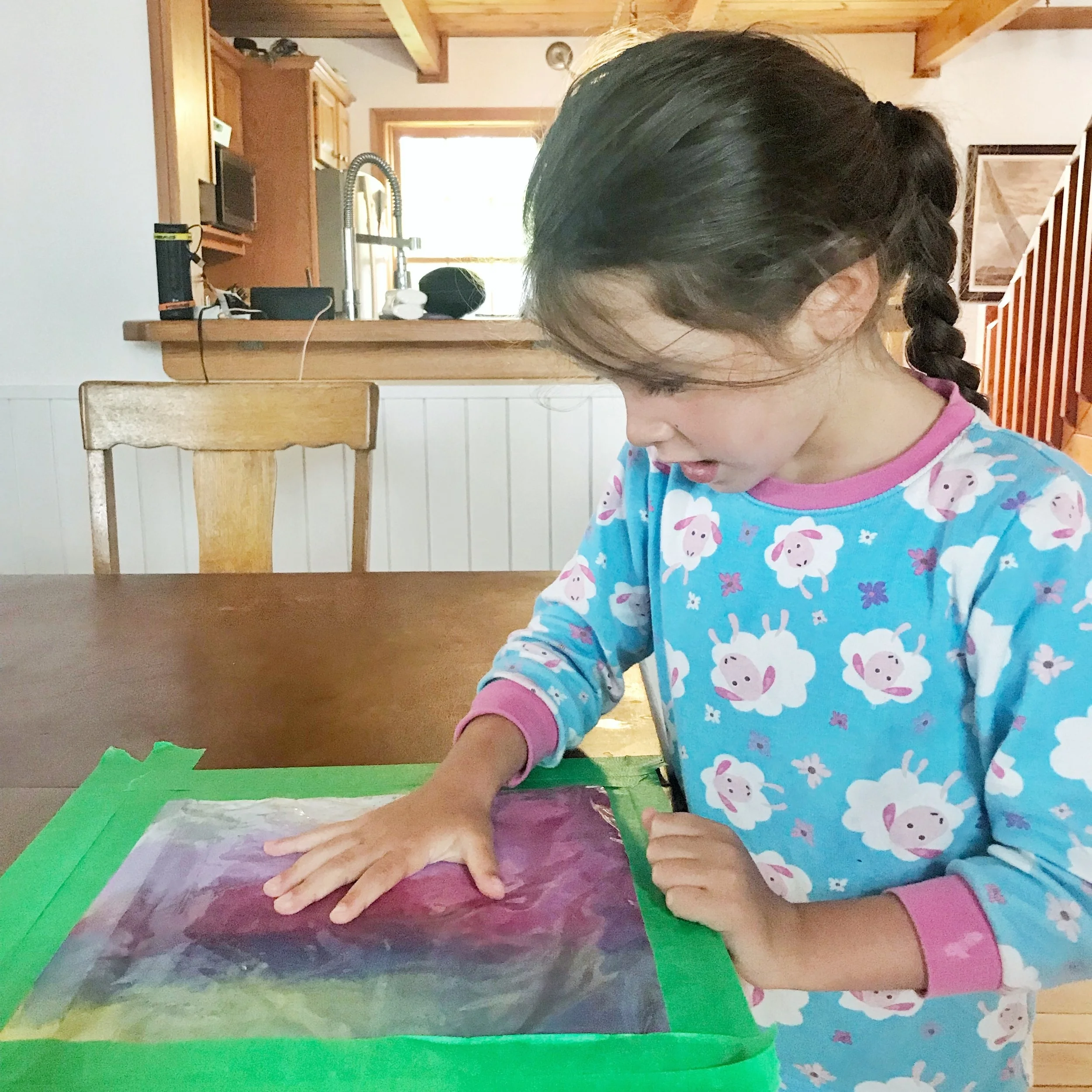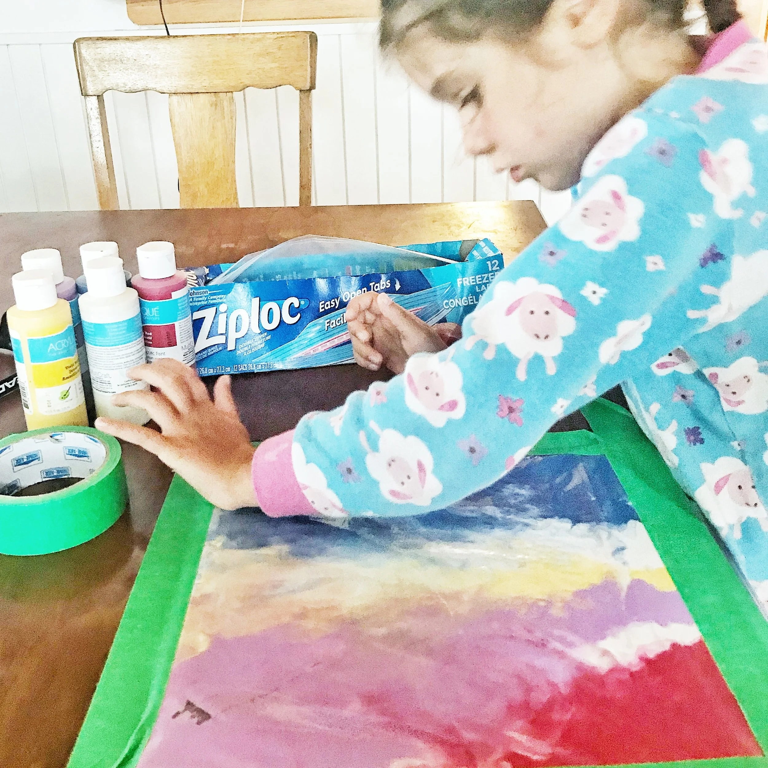 Squeeze about a tablespoon of various paints into a large Ziploc bag. Seal it. Tape it down to a table and let the kids go to town. Lennon said she was painting an island with the sky and some clouds. She was highly entertained so all the other kids wanted in on it too. The paint doesn't dry so they can continue to swirl and design for as long as they want!